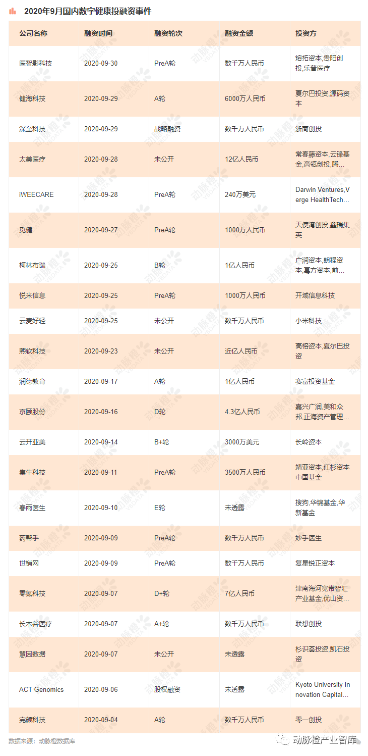 根据动脉橙数据库不完全统计,2020年9月,全球数字健康领域共发生73起融资事件(不包括IPO、定向增发等),披露融资总额超过28.02亿美元(约187.88亿人民币)。
