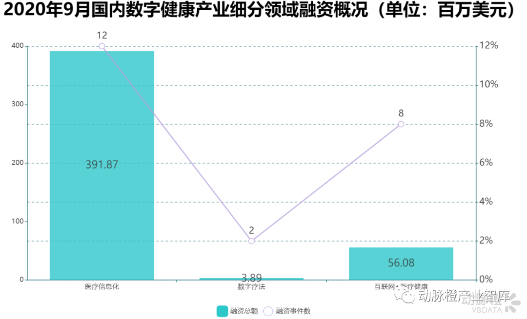 而数字疗法领域和医疗信息化领域在本月的融资数量差距较大,分别有9起融资项目和33起融资项目。其中,医疗信息化领域的融资总额达9.61亿美元,数字疗法领域的融资总额达到5.5亿美元。