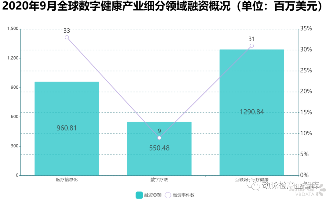 互联网+医疗健康在9月成为最吸金的数字健康细分领域,共有31起融资项目,融资事件数量较上月有所提升,融资总额达到了约12.91亿美元。